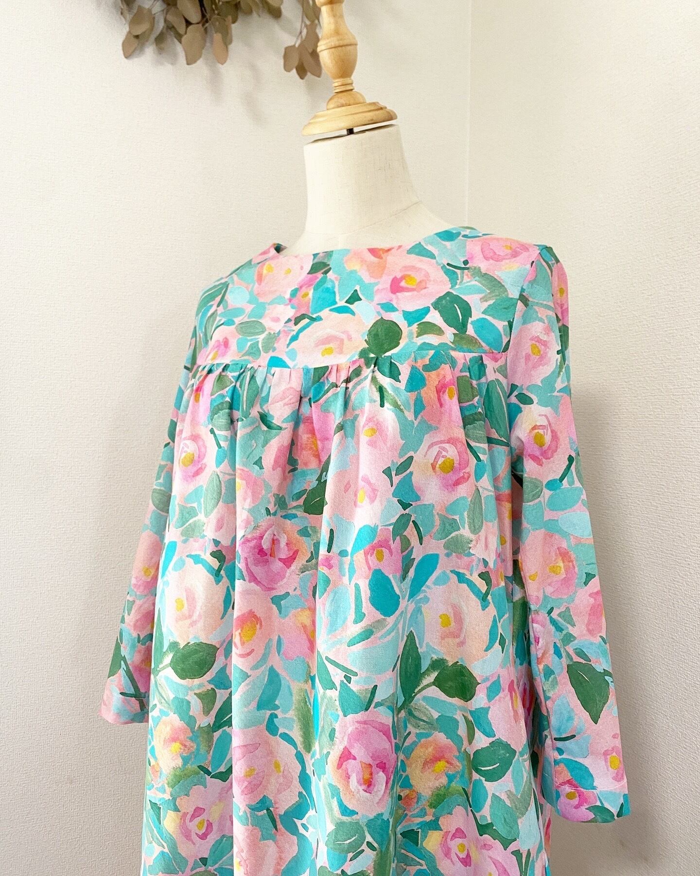 このギャザーワンピースは、薄手の生地をたっぷりと使い、軽やかな素材感とふんわりとしたギャザーが、贅沢なシルエットで着る人に特別な魅力を与えてくれます。