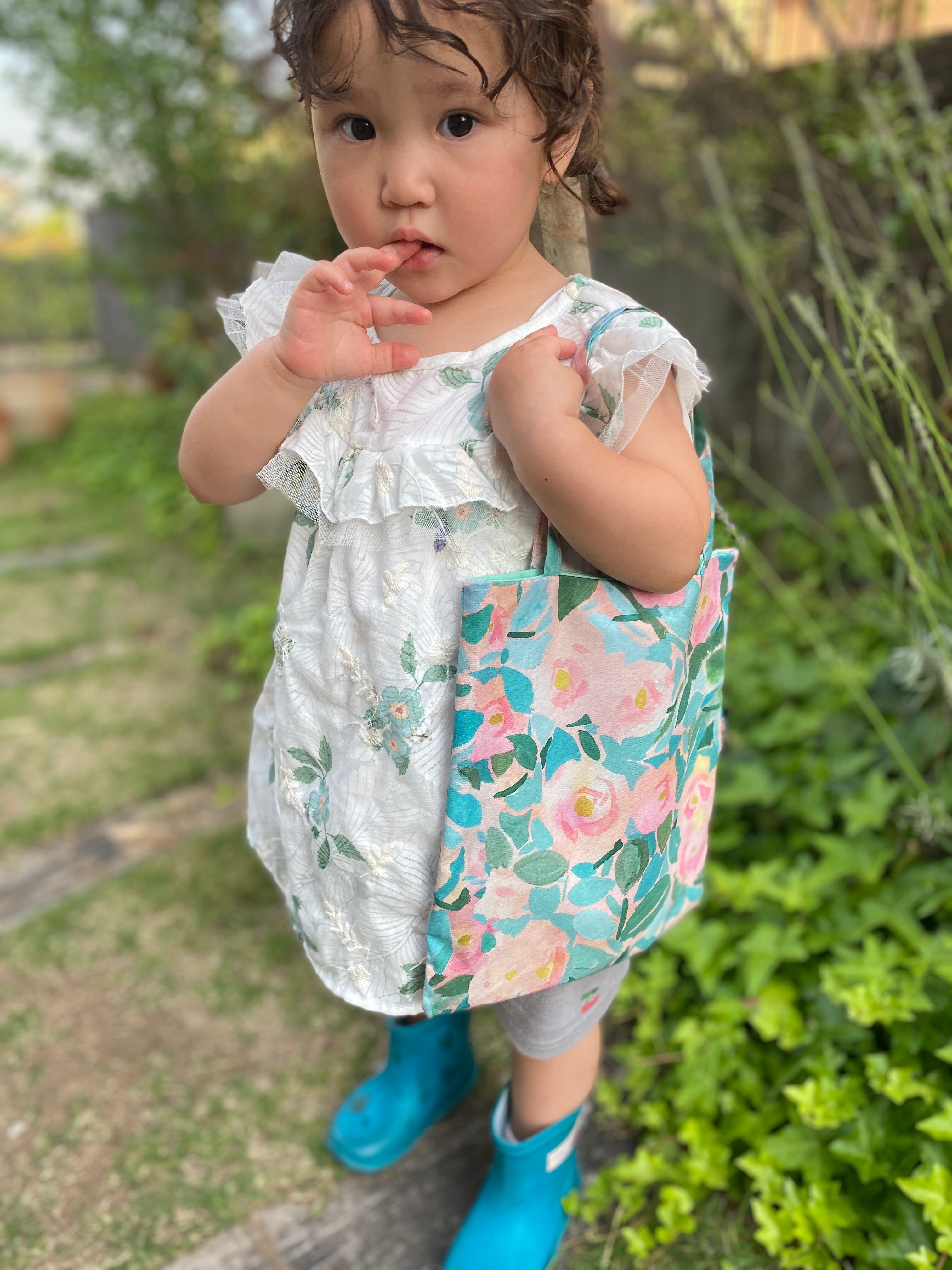 小さな手でも持ちやすい取っ手が付いているので、お子様が持っても可愛いです。お気に入りの絵本やおもちゃを入れてお出かけするのにぴったりなバッグ!