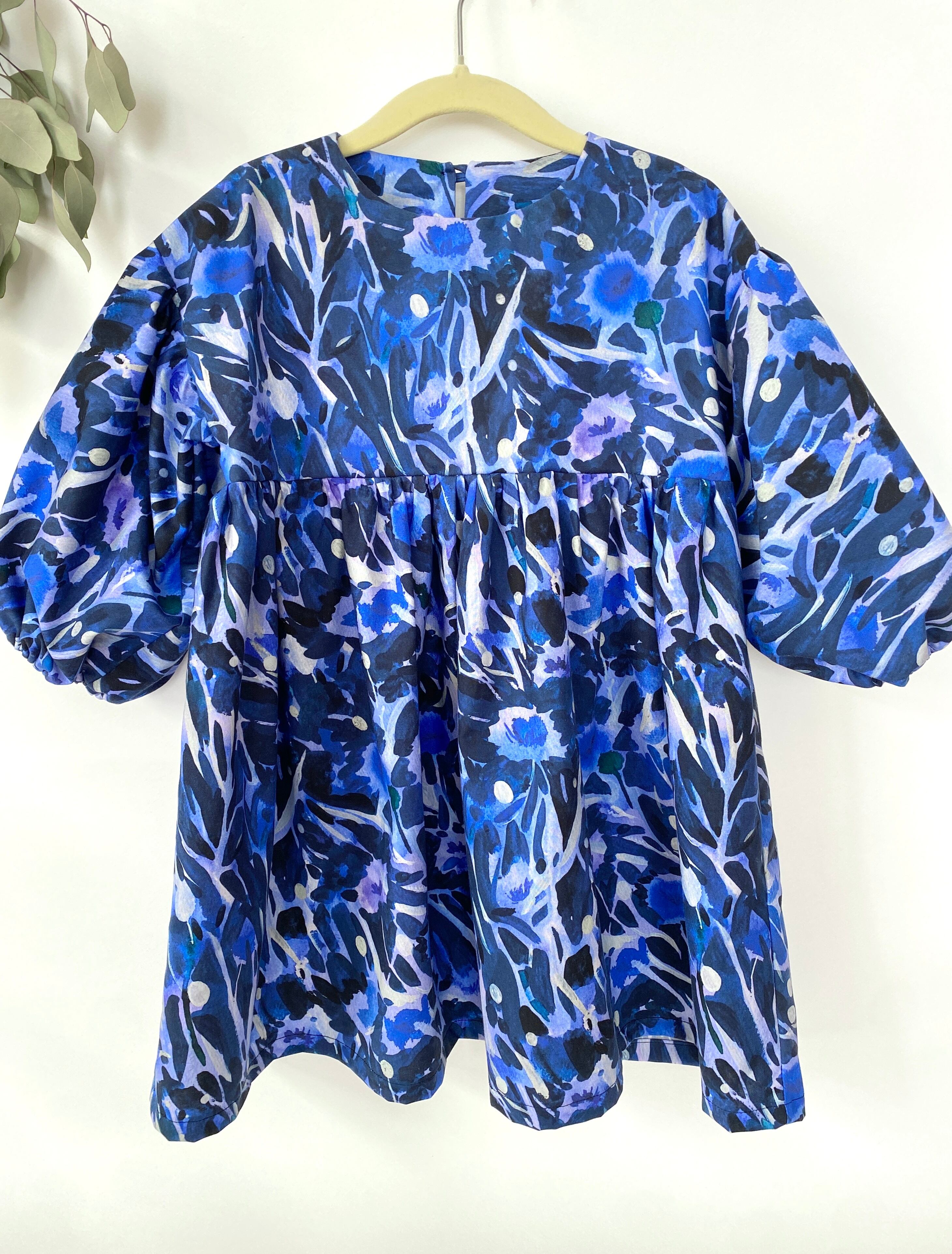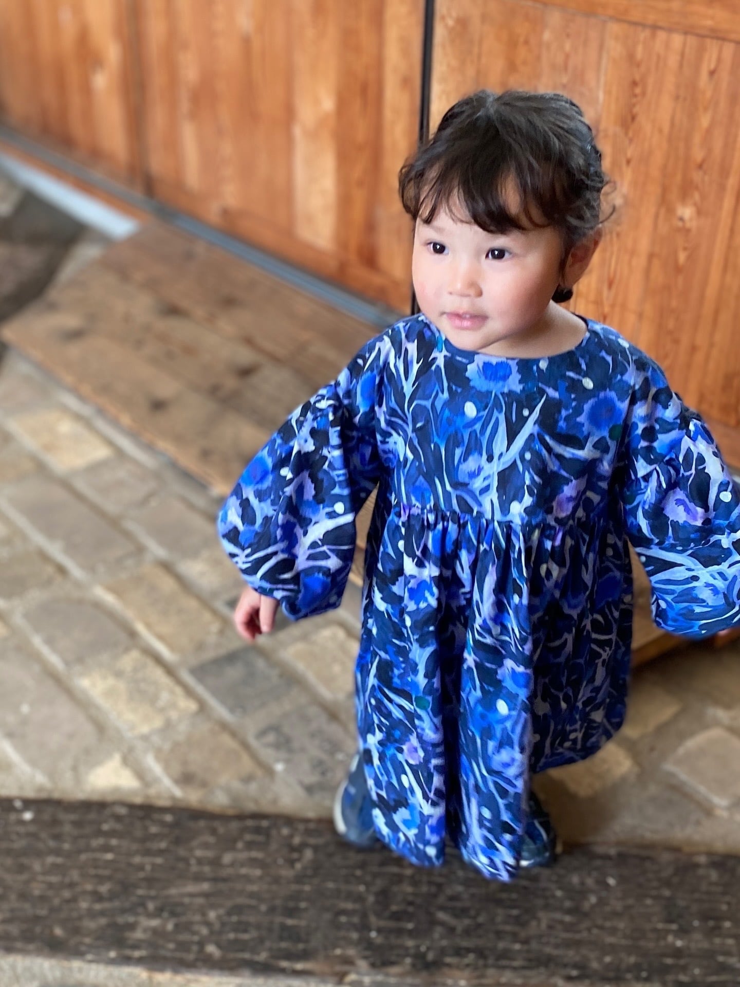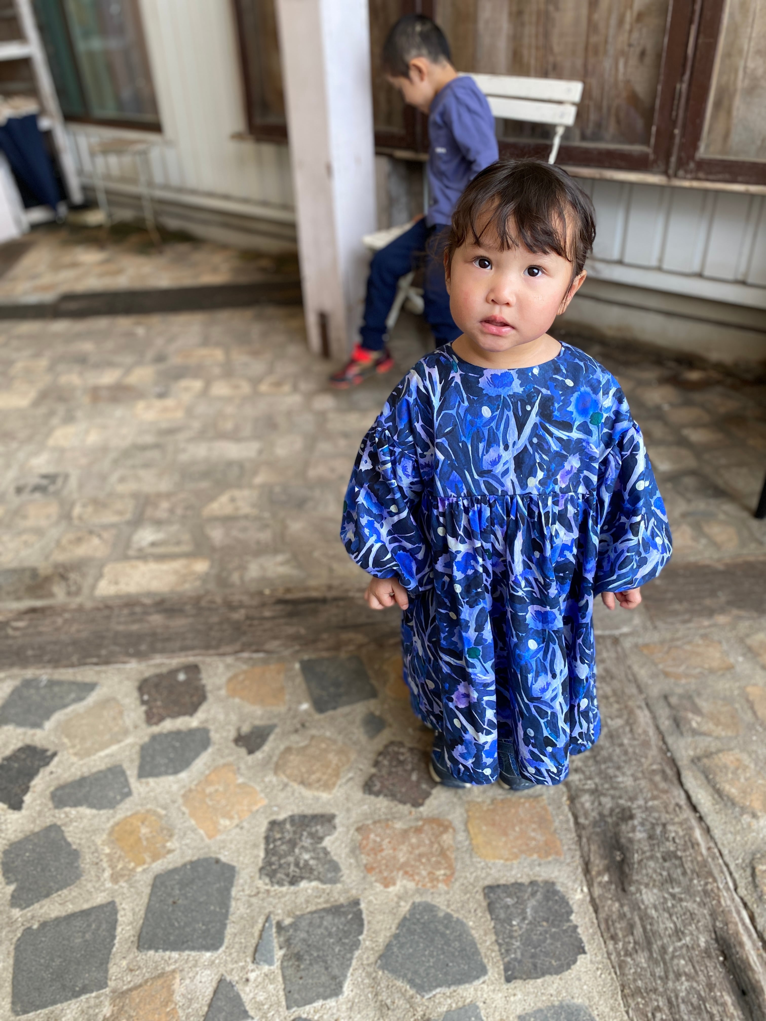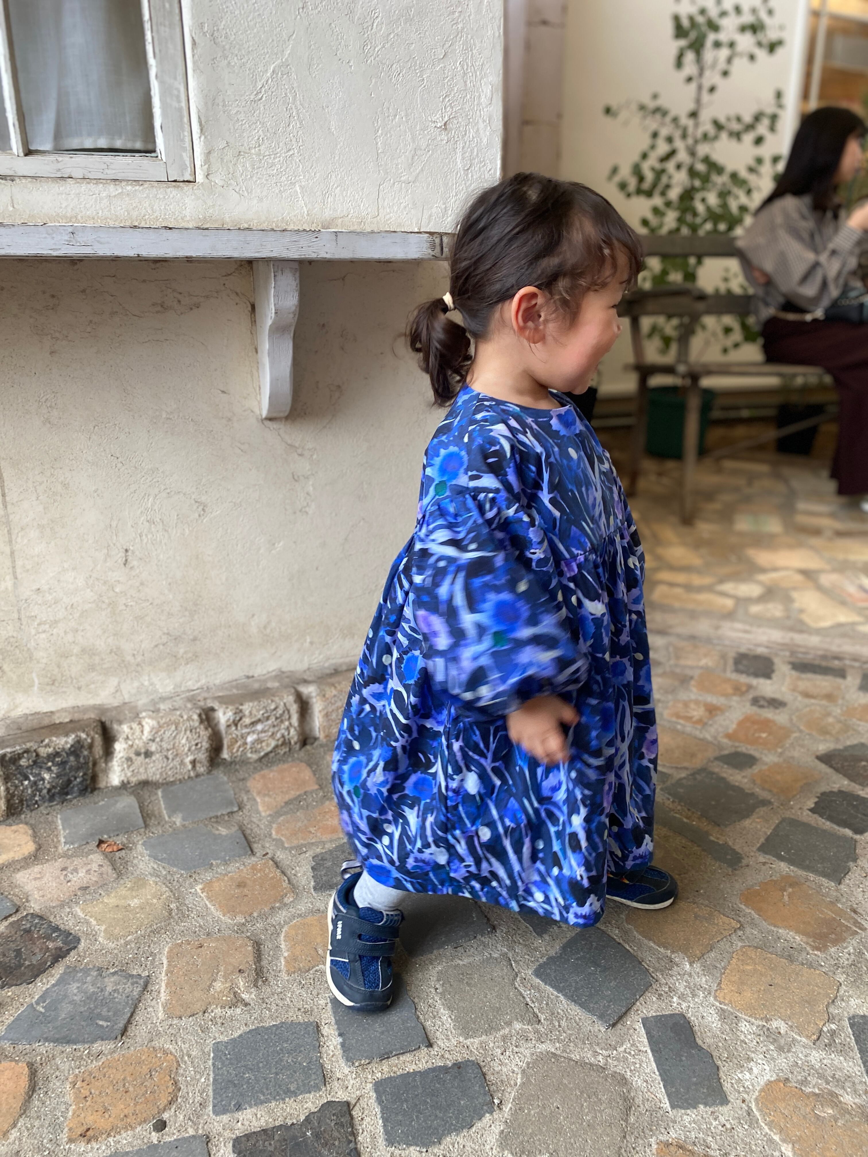 atelier aokaオリジナルテキスタイルを使用した、子供服ぽわん袖のワンピースです。落ち着いたブルーの色合いが特徴で、可愛らしさと大人っぽさを兼ね備えています。