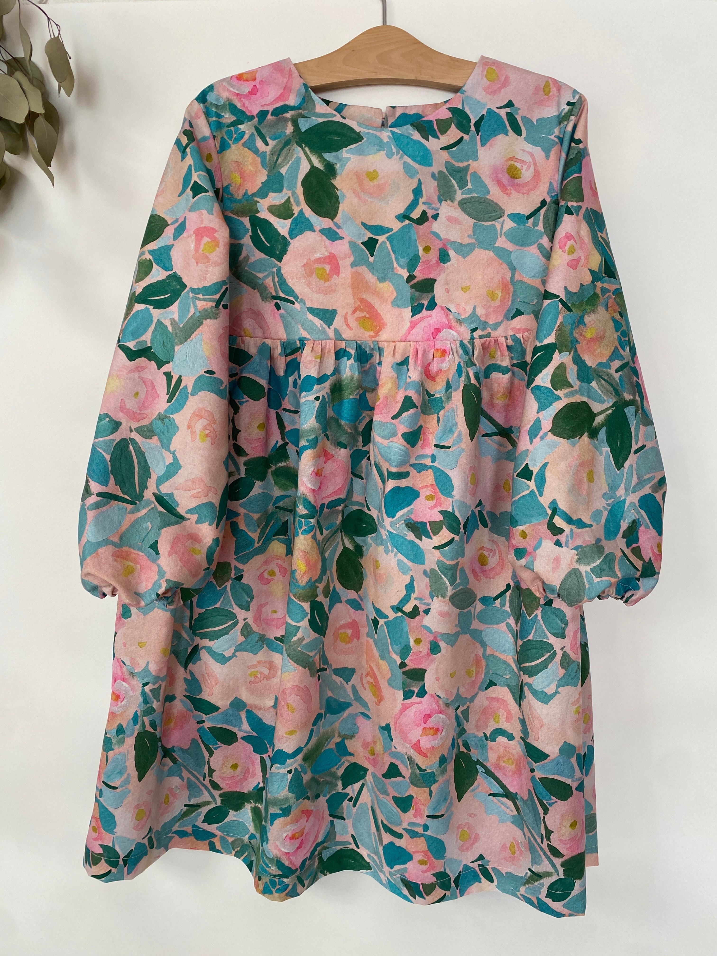 美しい「rose」の生地で作られた特別な日のワンピースは、130cmサイズで大人でも子供でもないサイズ感が魅力です。袖にはゴムが入っており、機能性を兼ね備えたデザインとなっています。