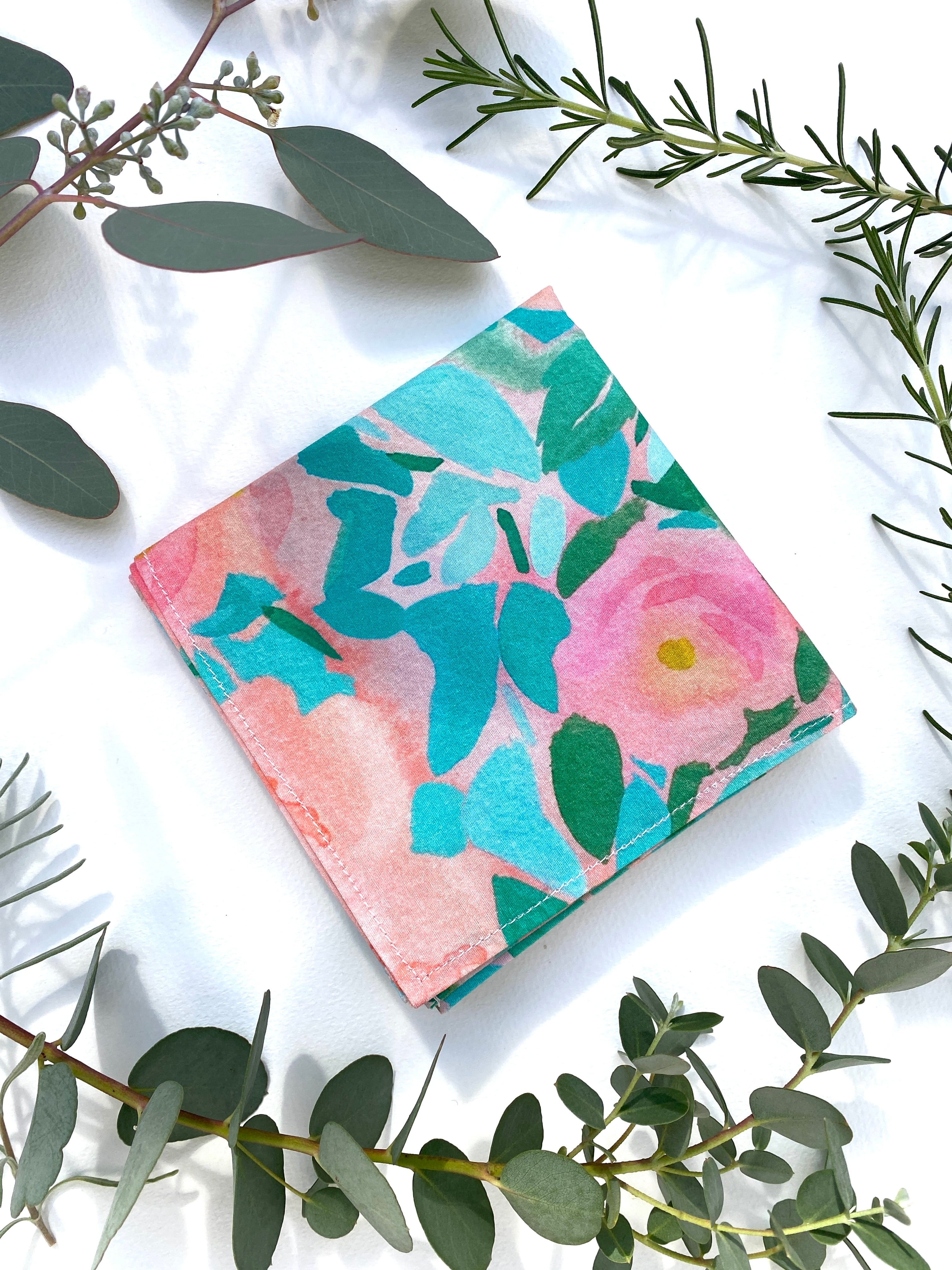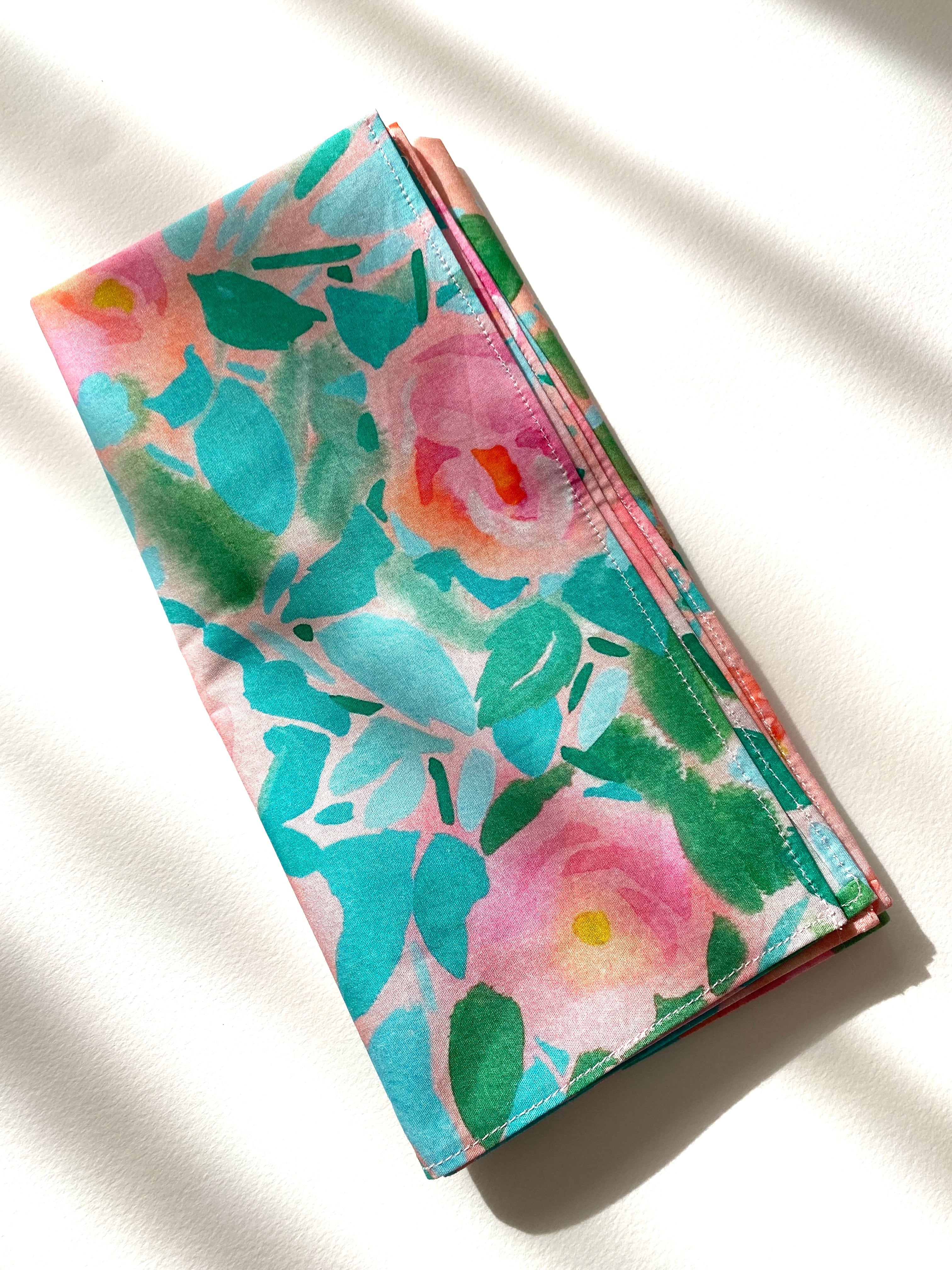 しっかりとしたコットンの40番手ブロード生地に、水彩画でバラの花を描いたオリジナルテキスタイルが顔料インクでプリントされています。吸水性が良く丈夫な生地でハンカチとしても、お弁当包みにも使えるサイズ感です。