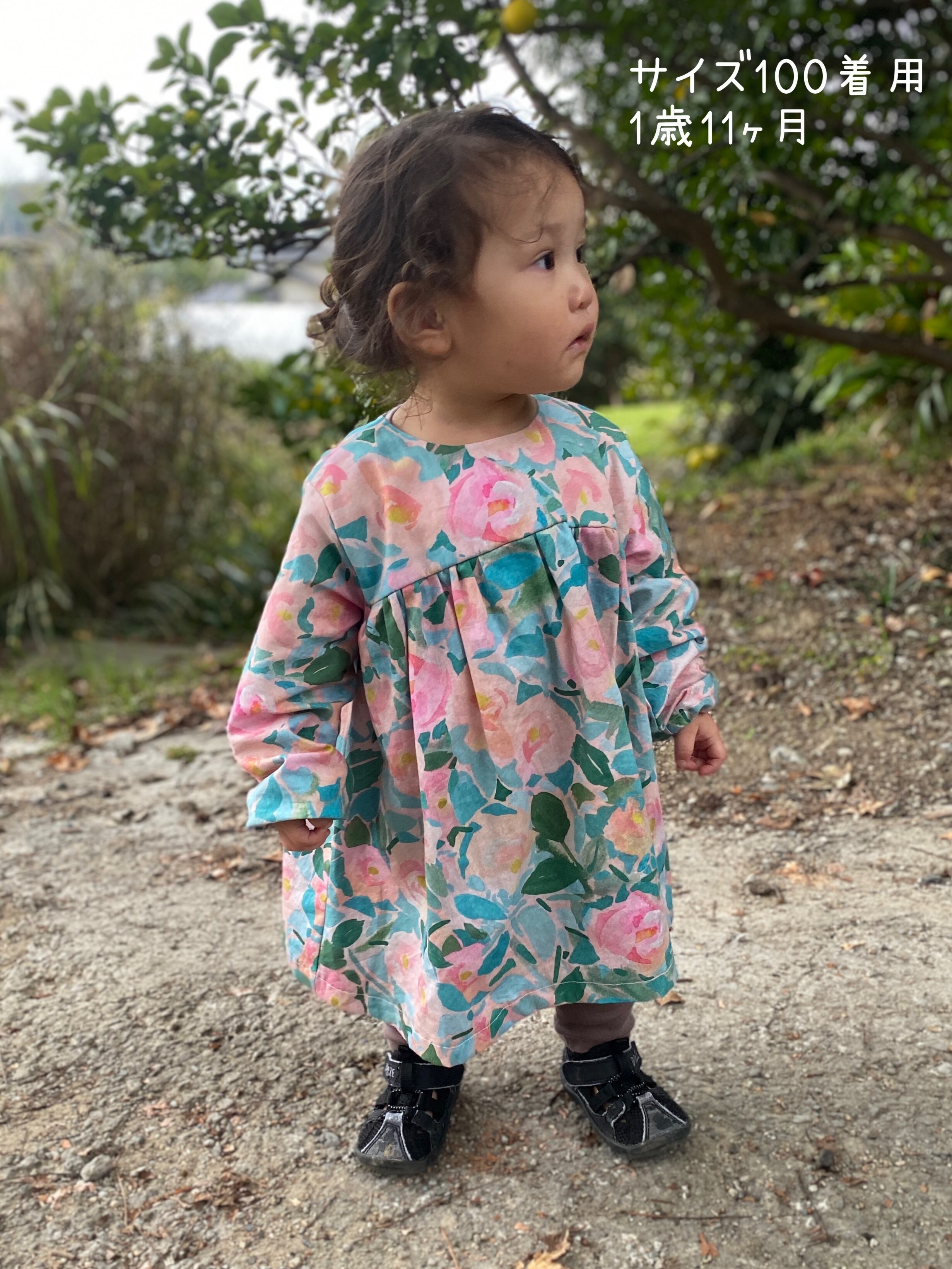 女の子のための可愛らしい長袖ワンピース。袖口にはゴムが施されており、動きやすさと快適さを兼ね備えています。オリジナルテキスタイル「rose」を使用したこのワンピースは、普段のお出かけや特別なイベントに最適です。大切な方へお祝いのギフトにもおすすめです。